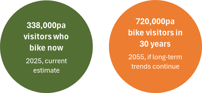 • If long-term average growth trends that have persisted for the past two decades continue then then there will be 100,000 additional bikers in Queenstown Lakes each year by 2035 compared with their 2025 level, while within 30 years there could be 400,000 more bikers each year than today.